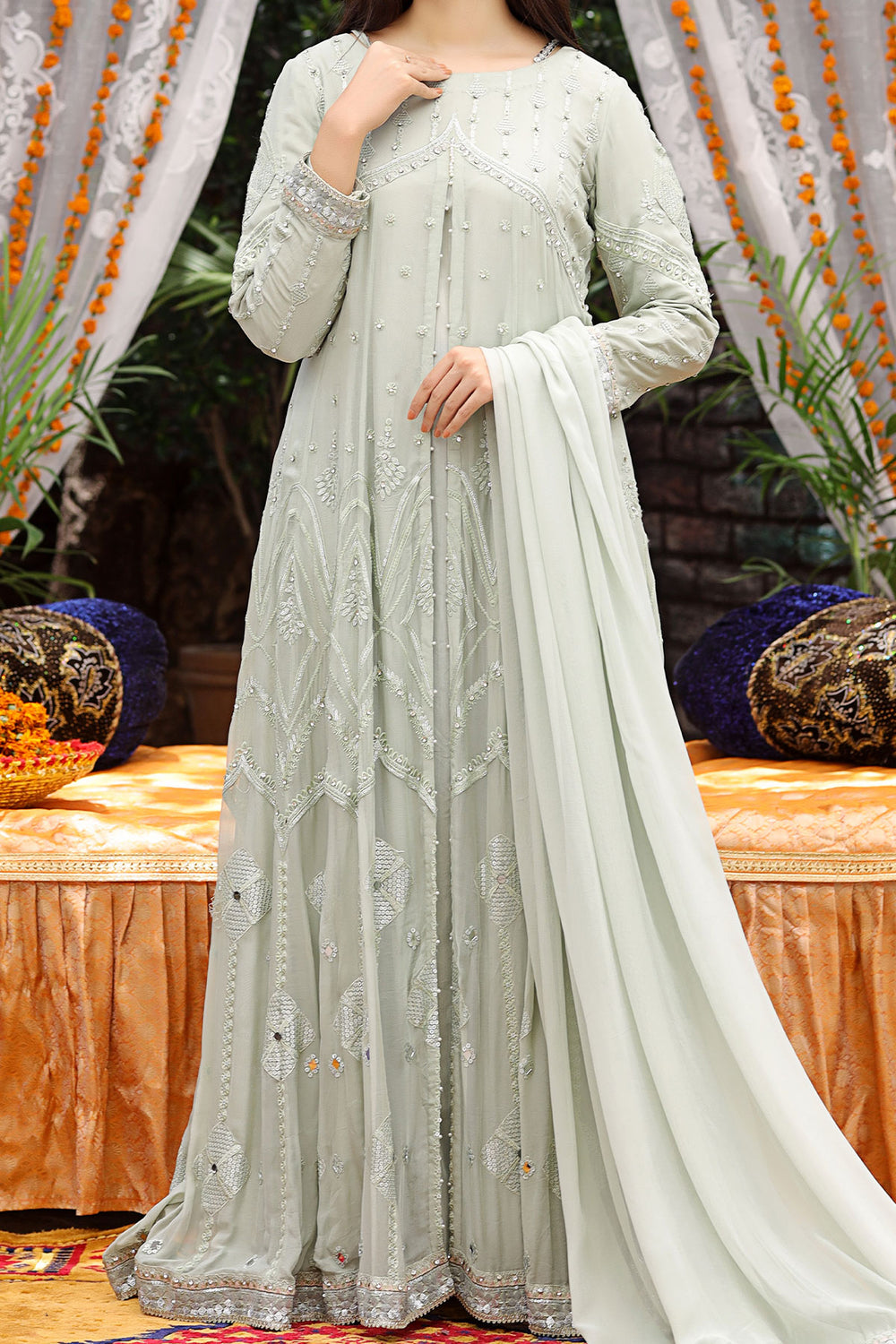 Work technique: Embroidery with Thread, Silver Sequins & Mirror work.Pattern: Maxi
