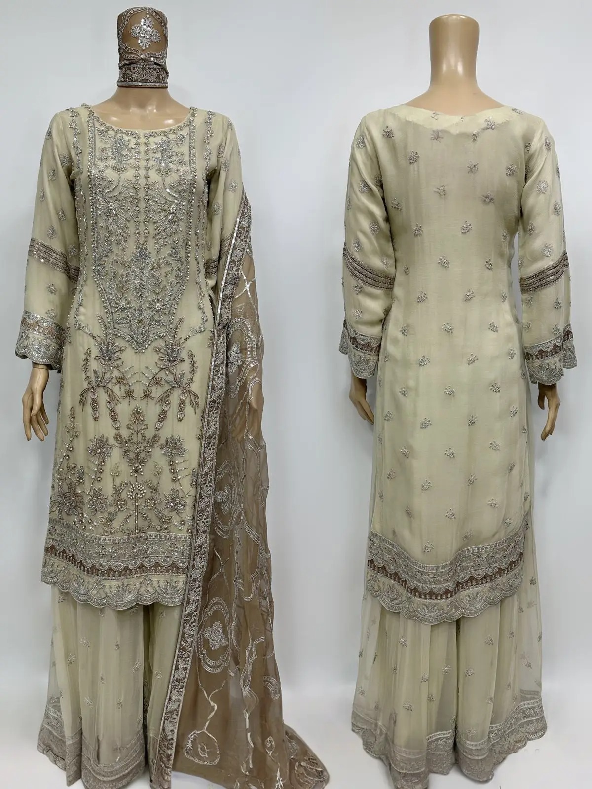 Work technique: Embroidery / Handwork.Pattern: Gharara Dress