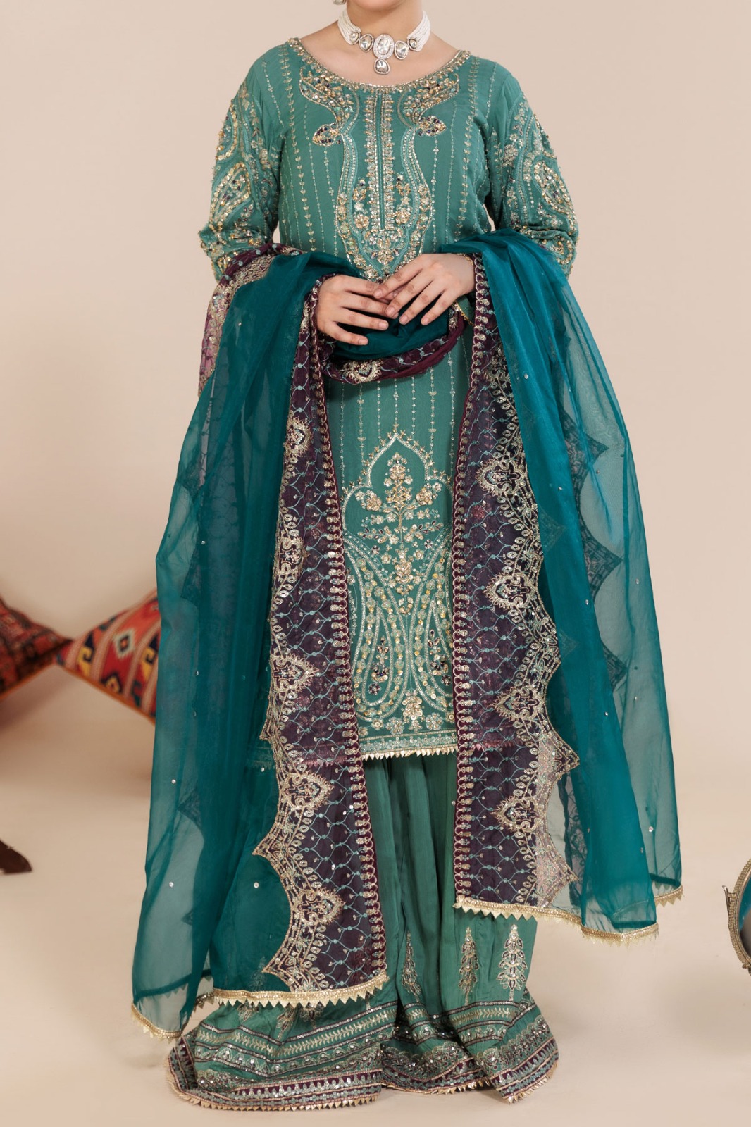 Work technique: Embroidery with sequin, Tilla, hand embellishment.Pattern: Gharara Dress