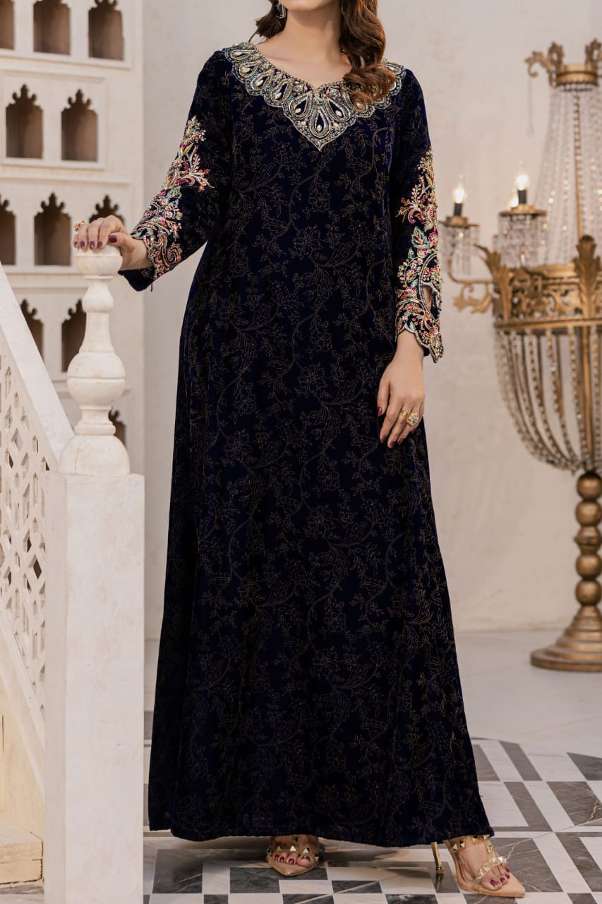 Pattern: Long A-line SilhouetteWork Technique: Hand Embellishment, Screen Print, Embroidery